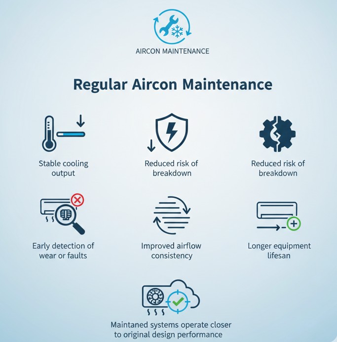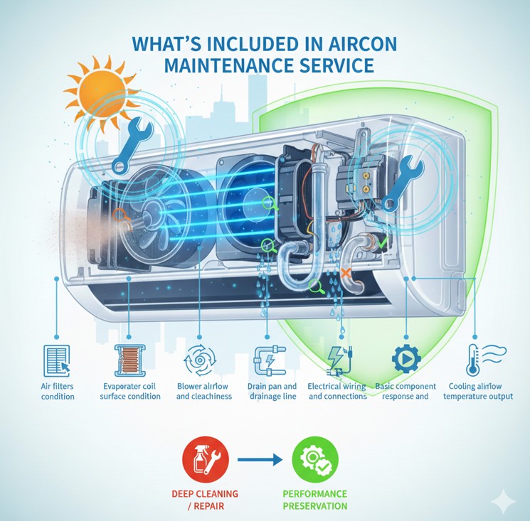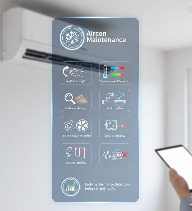 Aircon maintenance includes inspection of airflow, coil condition, drainage, electrical connections, and cooling performance to keep the system operating efficiently and detect early faults.