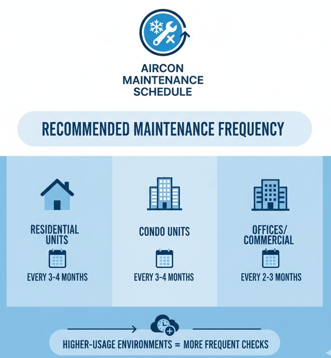 Most QC aircons require maintenance every 3β4 months due to continuous use and dust exposure. Offices and high-usage units often need maintenance every 2β3 months.